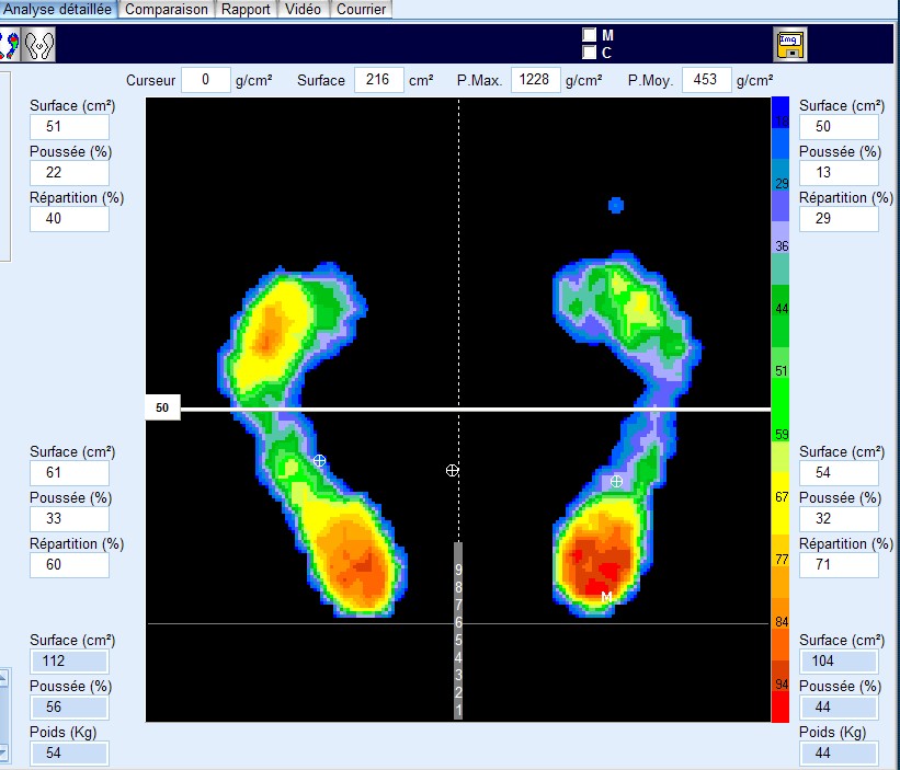 Ensuite nous vous examinerons debout au podoscope électronique, au podoscope à lumière tangentielle, en vidéo sur la piste de marche.